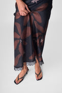 - Sheer black lace panel around the waist and back